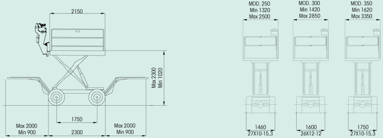 Nr. 1 pedana centrale a sollevamento idraulico; (misure disponibili e corsa di sollevamento sono visibili nei disegni acclusi). Fascia fermapedie smontabile.